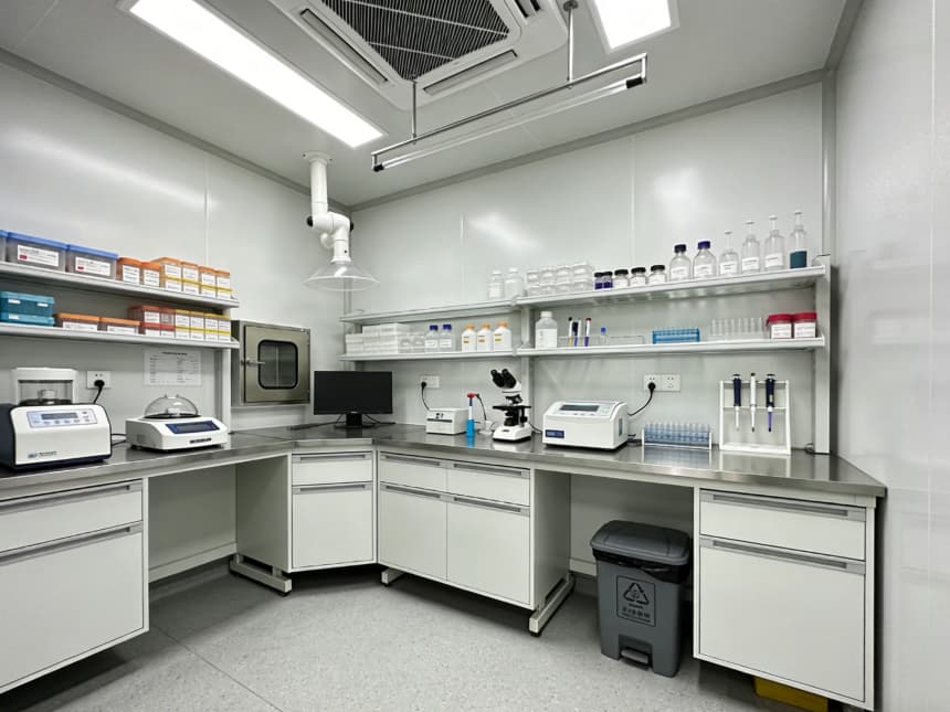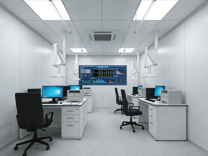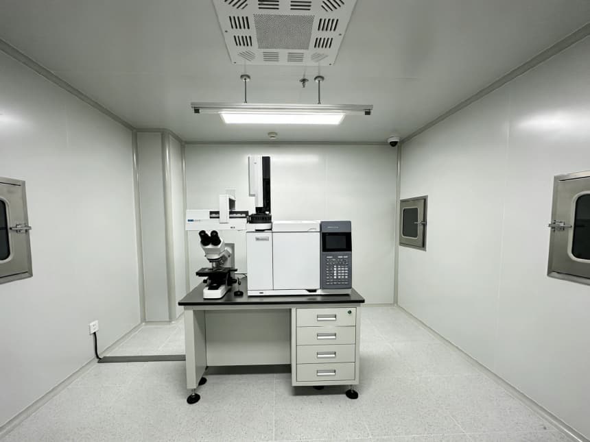 內(nèi)部檢測空間均以淺灰色耐磨地坪搭配白色無縫潔凈墻面,視覺整潔且適配檢測核心需求。淺灰色地面選用高硬度環(huán)氧材質(zhì),抗壓耐磨、抗污易清潔,可耐受檢測過程中各類試劑殘留與設(shè)備搬運(yùn)磨損;白色墻面采用環(huán)保抗菌涂層,平整度高、反光均勻,搭配嵌入式防眩光照明,為精密檢測提供清晰穩(wěn)定的視覺環(huán)境,減少誤差干擾。
