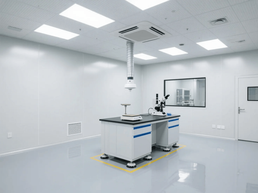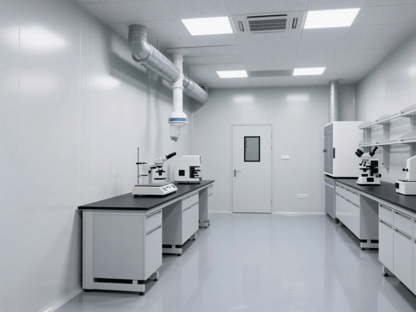 本方案采用高級灰與純白作為主色調(diào),打造嚴(yán)謹(jǐn)專業(yè)的實(shí)驗(yàn)環(huán)境。墻面選用50mm厚聚氨酯保溫彩鋼板,表面覆有抗菌涂層,接縫處采用無縫焊接工藝處理。地面鋪設(shè)2mm厚環(huán)氧自流平地坪,具有優(yōu)異的耐化學(xué)腐蝕性能,灰白相間的分區(qū)標(biāo)識既美觀又實(shí)用。