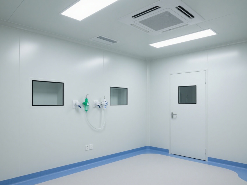 該醫(yī)療無塵室是為醫(yī)療診療與精密操作打造的專業(yè)潔凈空間。室內(nèi)以白色為主調(diào),搭配藍(lán)色標(biāo)識系統(tǒng),墻面、地面采用無縫抗菌材質(zhì),便于清潔消毒,有效防止微生物與灰塵