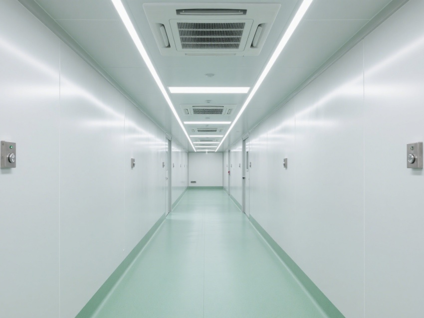 實驗室內部采用了白色和淺綠色為主的配色方案,營造出一種干凈、整潔的視覺感受。墻面、地面和天花板均采用無縫設計,便于清潔和消毒,防止微生物和灰塵的積聚。照明系統明亮且均勻,提供了良好的工作環境。
