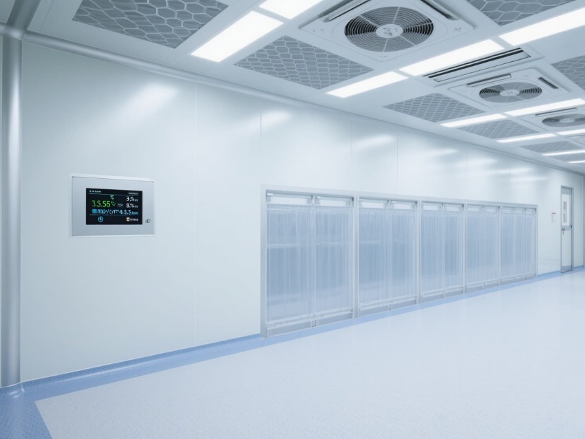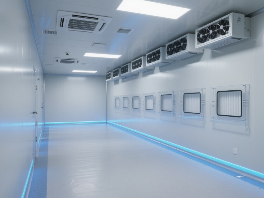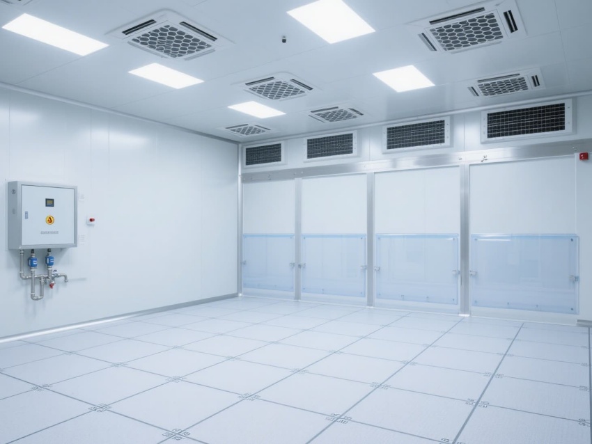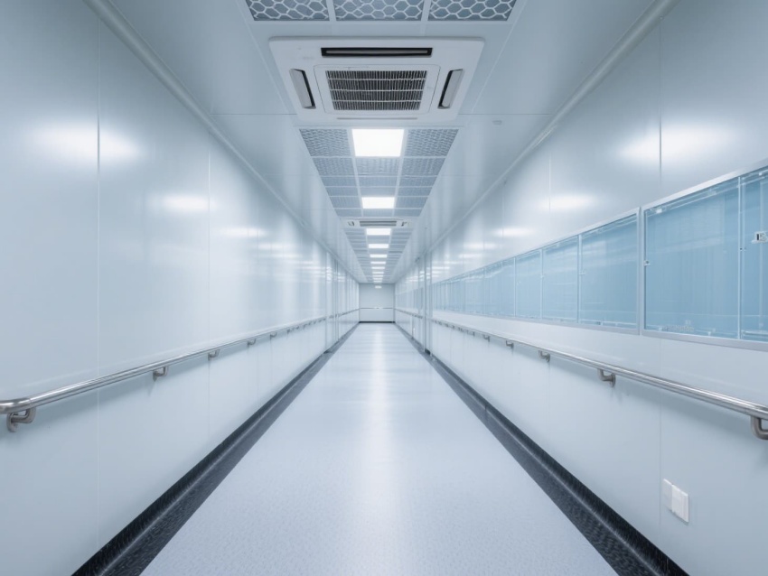 墻面與地面的圓弧角處理,配合不銹鋼潔凈門窗,既避免衛生死角,又增強空間密閉性。嵌入式LED潔凈燈提供均勻照明,照度達300-500lux,滿足精密操作需求。車間內的防靜電接地系統與恒溫恒濕控制(溫度22±2℃,濕度50±5%),為芯片光刻、蝕刻等關鍵工序提供穩定環境,有效降低微塵與靜電對芯片良率的影響。