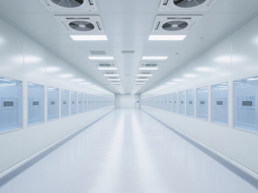 電子芯片廠無塵車間是芯片高精度生產的核心空間,其設計嚴格遵循百萬級潔凈標準。車間以銀白色抗菌彩鋼板搭建墻體與吊頂,搭配淺灰色防靜電環氧地坪,形成簡潔統一的視覺基調。頂部密布的高效過濾器與FFU風機組,通過層流方式持續凈化空氣,確保每立方米空氣中0.5微米以上的塵埃顆粒不超過3520個。?