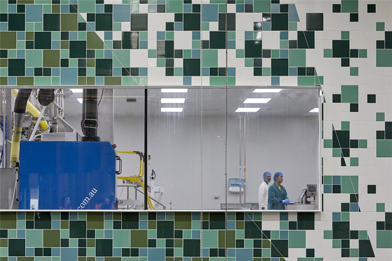 多彩的線條從附近的自然保護區(qū)一直延伸到位于生產(chǎn)區(qū)核心地帶的巨型壁畫上,吸引著員工和參觀工廠的訪客。產(chǎn)自本地的澳洲硬木和紋理豐富的墻面從外部景觀“流進”室內(nèi),在自然光線的配合下營造出富有生機的氛圍。