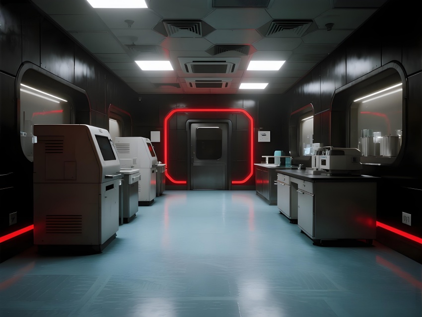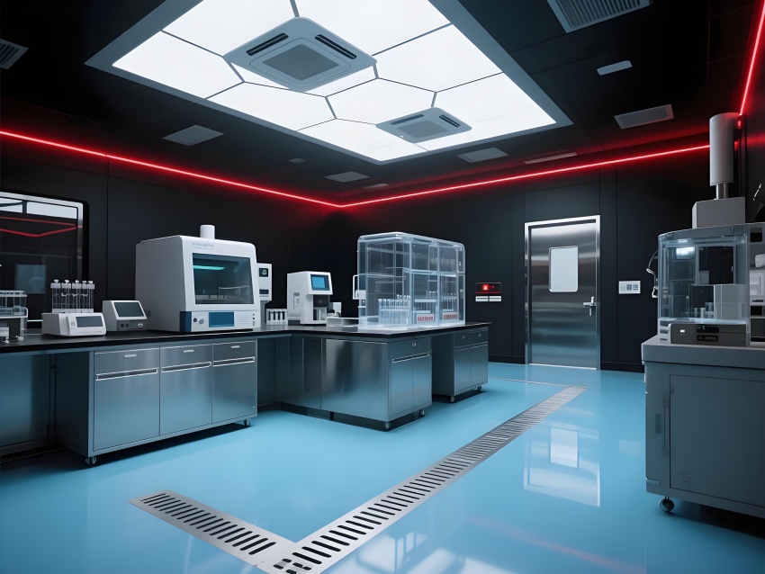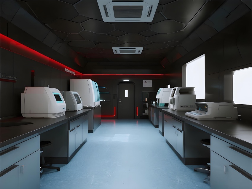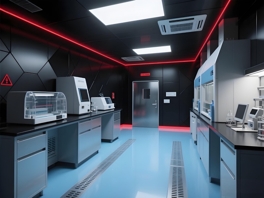 本實驗室采用"生物防御未來主義"風(fēng)格,通過銳利的幾何切割與警示色彩構(gòu)建科研防護(hù)美學(xué)。核心實驗區(qū)以啞光黑墻面搭配紅色應(yīng)急光帶,形成視覺危險預(yù)警,與清潔區(qū)的冰藍(lán)色環(huán)氧樹脂地面構(gòu)成強烈功能區(qū)分。設(shè)備區(qū)的金屬原色與透明PCR儀散熱孔展現(xiàn)工業(yè)精密感,天花板的六邊形送風(fēng)單元與地面導(dǎo)流孔形成垂直氣流可視化。防爆玻璃觀察窗嵌入電子壓差顯示屏,氣閘室的黃色斜紋標(biāo)識強化生物安全等級過渡。通過冷白光與設(shè)備界面藍(lán)光的層疊照明,在滿足BSL-2物理防護(hù)要求的同時,營造出科幻電影般的嚴(yán)謹(jǐn)科技氛圍,傳遞基因工程特有的精密與危險并存的特質(zhì)。