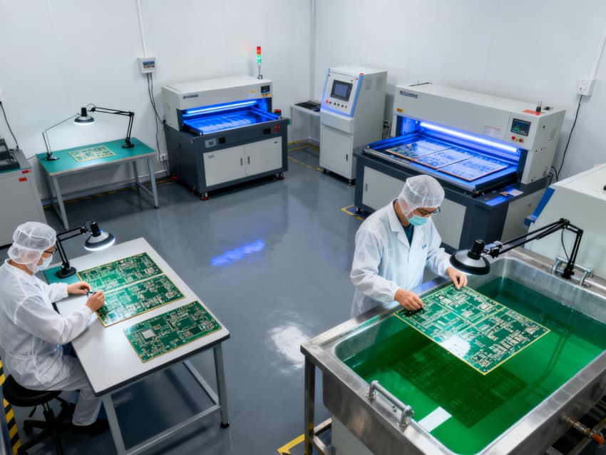 各車間功能定位清晰,適配全生產鏈路:基板裁切車間預留大型裁切設備安裝位,空間開闊便于物料轉運;光刻車間采用密閉式布局,預留恒溫恒濕及避光系統接口;蝕刻車間強化通風管道預留,適配酸堿試劑使用需求;鉆孔車間預留高精度鉆孔機安裝基礎,地面做防震處理;阻焊車間側重潔凈防護,預留噴涂設備工位;成型車間規劃物料緩存區與成品檢測區;測試車間預留各類檢測儀器接口;包裝車間劃分潔凈包裝區與周轉區。